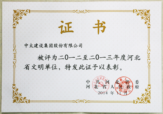 近日,中共河北省委、河北省人民政府公布“2012--2013年度河北省文明單位”評選結果,中太建設集團憑借良好的社會形象再斬殊榮,這也是集團公司連續8年獲此榮譽。
