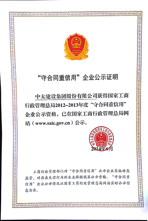 日前,由國家工商總局傳來消息,包括中太建設集團在內的5035家企業獲得國家工商總局2012-2013年度“守合同重信用”企業公示資格,這也是集團公司首次榮獲中國企業信用的最高榮譽。