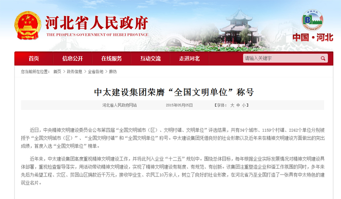 河北省人民政府網站報道了中太建設集團榮膺“全國文明單位”稱號
