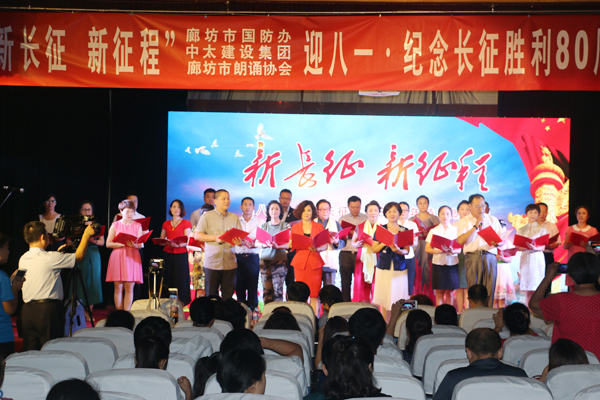 7月30日上午,由市國防教育辦公室、中太建設集團主辦,廊坊市朗誦協會承辦的“新長征新征程”迎八一·紀念長征勝利80周年詩歌朗誦會在中太大廈二樓報告廳舉行。來自市國防教育辦公室、市朗誦協會、中太建設集團及廊坊區域內的朗誦愛好者齊聚一堂,以詩歌朗誦的形式共同迎接中國人民解放軍89歲生日,共同慶祝中國工農紅軍長征勝利80周年。