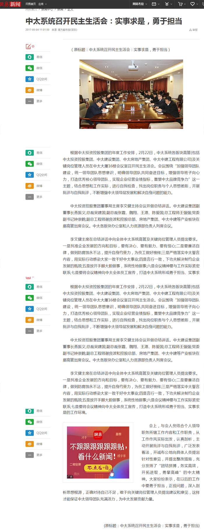 網易新聞報道了“中太系統召開民主生活會:實事求是,勇于擔當”