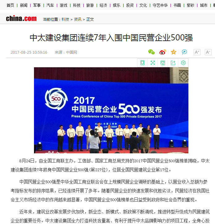 中華網(wǎng)報道了“中太建設(shè)集團連續(xù)7年入圍中國民營企業(yè)500強”