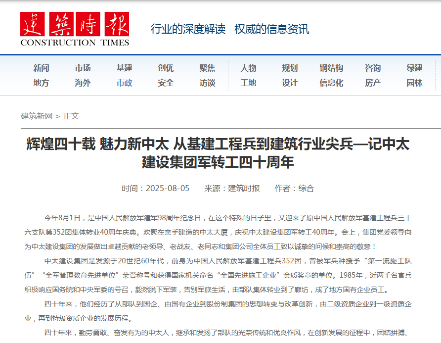 建筑時報8月5日報道了輝煌四十載 魅力新中太 從基建工程兵到建筑行業尖兵——記中太建設集團軍轉工四十周年