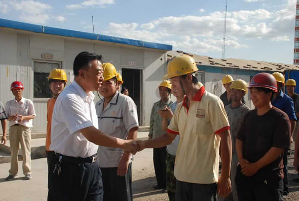 6月30日下午,市人大副主任、總工會主席王瑞峰代表市總工會來到集團九公司“龍河盛都”項目施工現場,看望慰問在炎熱酷暑下,仍然堅持施工的一線工人,并送來了白糖、毛巾、綠豆、礦泉水等防暑降溫慰問物品。市總工會黨組書記、常務副主席關景發(fā)、副主席王泰山、市建設局工會主任王克峰等領導同志和集團工會主席鐘崇鶴、建設集團副總經理林維生陪同慰問。