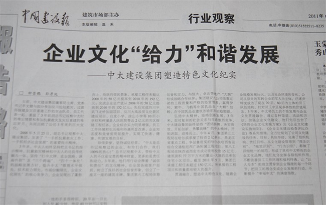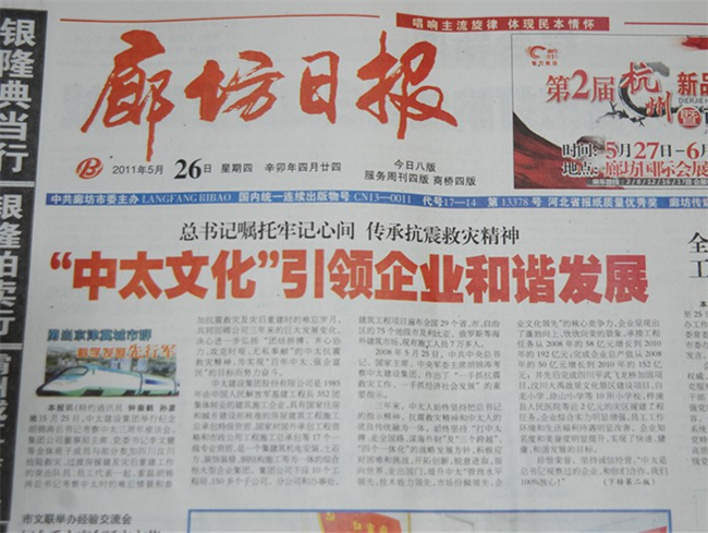 近日,中國建設(shè)報(bào)、文匯網(wǎng)、河北經(jīng)濟(jì)日報(bào)、長城網(wǎng)、廊坊日報(bào)等多家媒體對公司三年來銘記胡錦濤總書記視察中太囑托、弘揚(yáng)抗震救精神,創(chuàng)新發(fā)展,銳意進(jìn)取所取得的豐碩成果進(jìn)行集中報(bào)道,擴(kuò)大了企業(yè)知名度,提升了中太品牌的社會影響力。