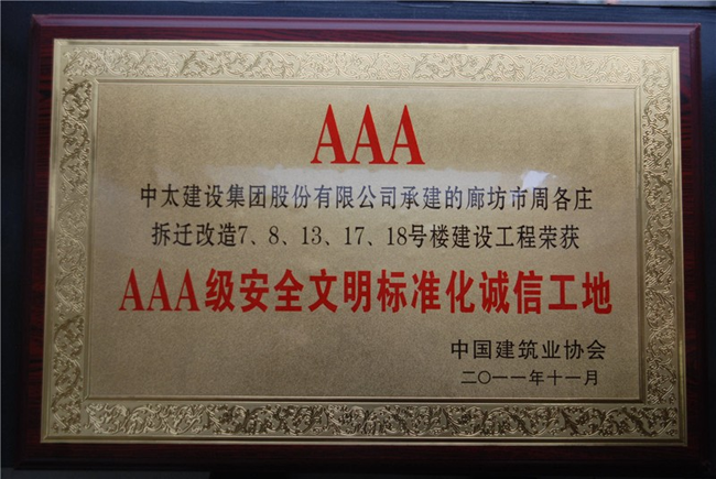 近日,中國建筑業(yè)協(xié)會發(fā)布2011年全國 AAA級安全文明標準化誠信工地評定名單,中太建設集團承建的廊坊市周各莊拆遷改造7、8、13、17、18號樓建設工程獲評2011年全國 AAA級安全文明標準化誠信工地。
