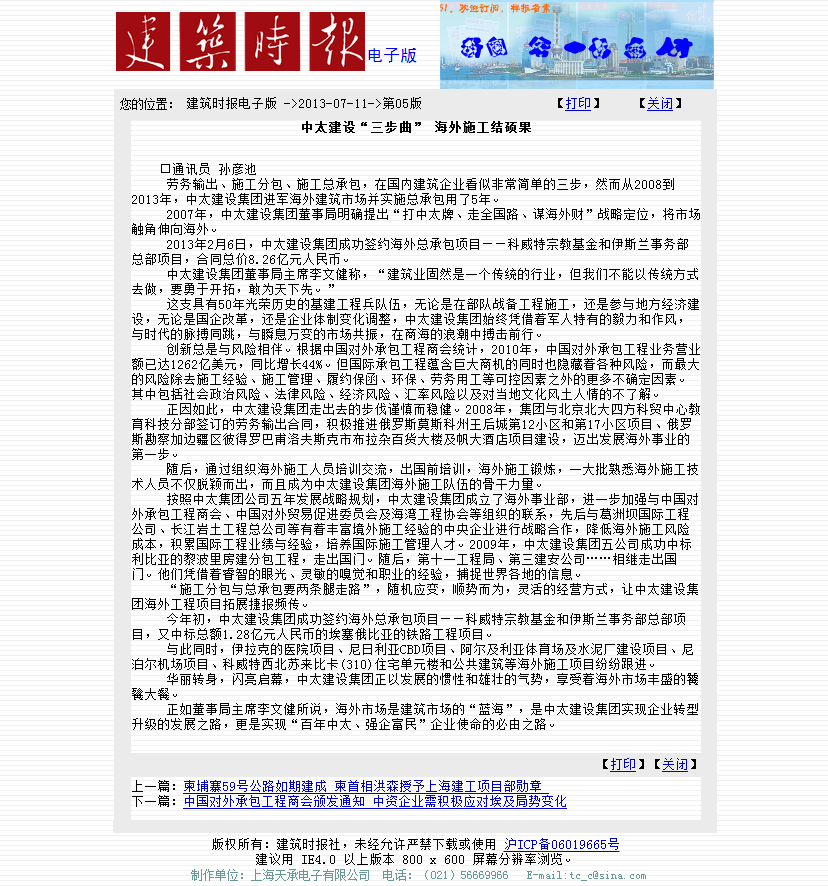 《建筑時(shí)報(bào)》7月11日第五版報(bào)道了中太建設(shè)集團(tuán)進(jìn)軍海外市場(chǎng)結(jié)碩果