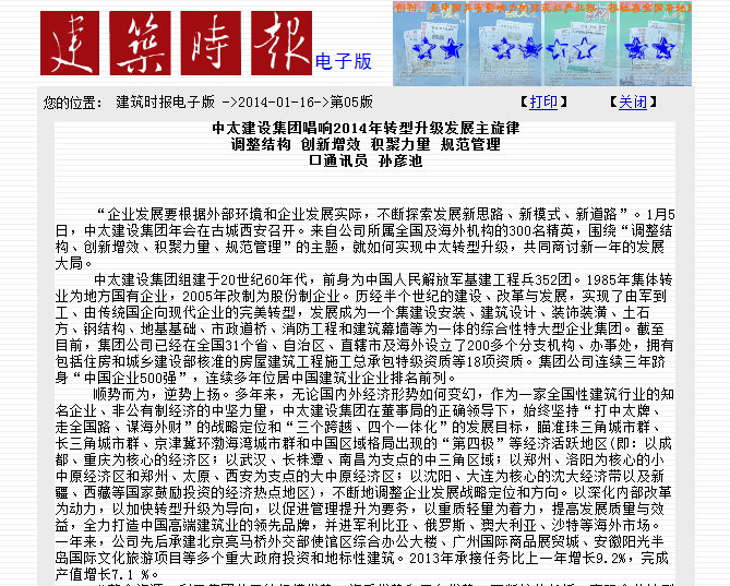 建筑時報(bào)2014年1月16日報(bào)道了中太建設(shè)集團(tuán)唱響2014年轉(zhuǎn)型升級發(fā)展主旋律