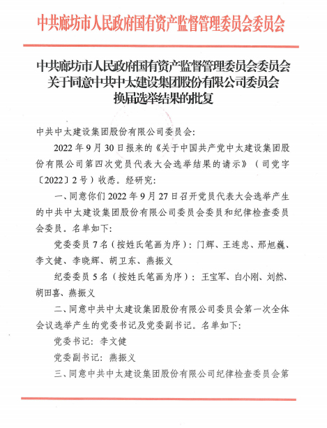 | [2022] 3號關于轉發《中共廊坊市國有資產監督管理委員會委員會關于同意中共中太建設集團股份有限公司 |